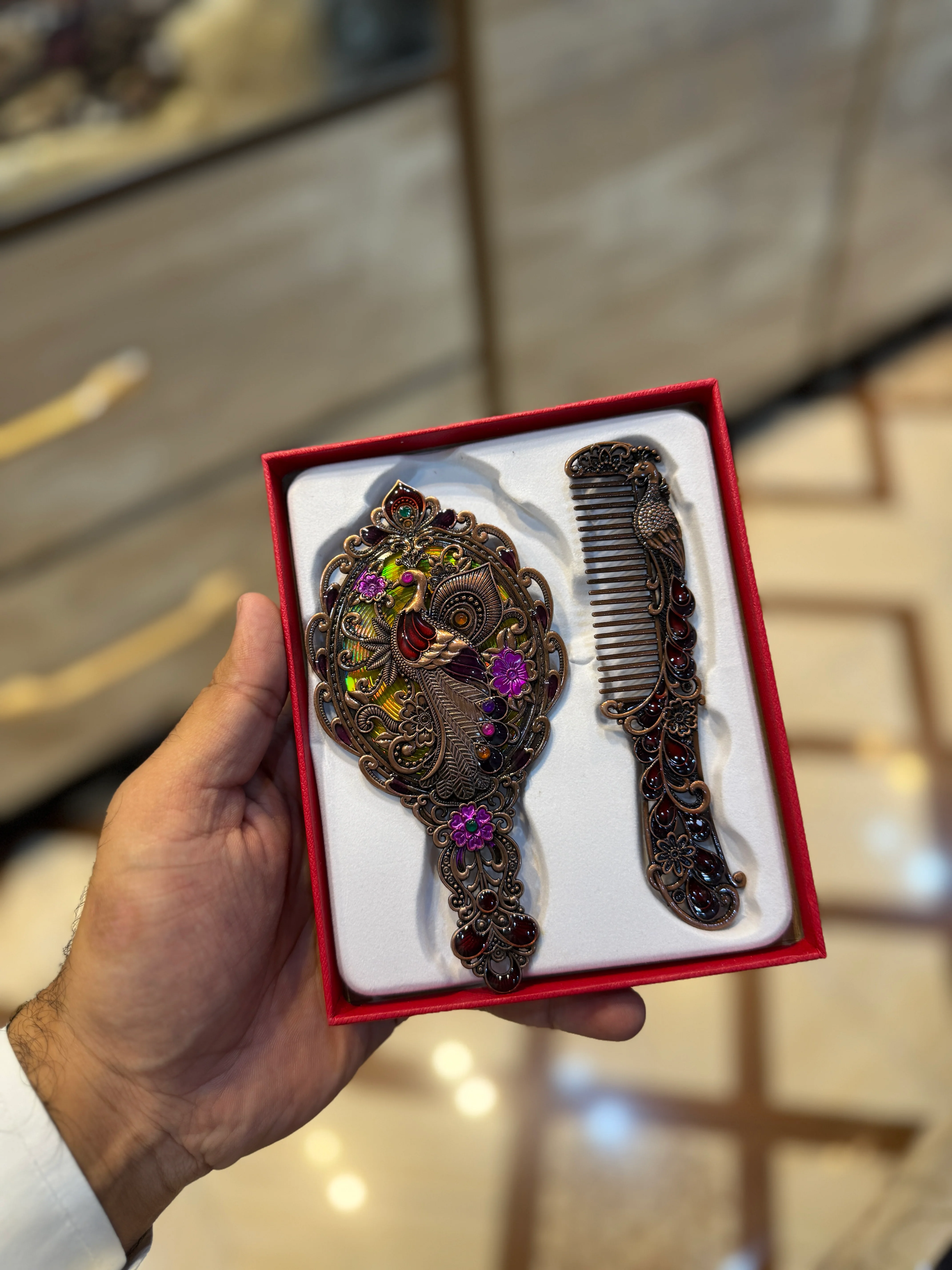 Discover the ancient beauty secrets of Egypt with our Golden Mirror&Comb. Crafted with luxurious gold, this set enhances your beauty routine while adding a touch of elegance. The mirror provides a clear and precise reflection, while the comb gently glides through your hair, leaving it smooth and tangle-free. Add a touch of luxury to your daily routine with our Golden Mirror&Comb.